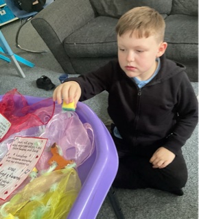 Orchard classes explored the ‘part of the party’ story and sensory tray. The story represents different families in relation to LGBTQ+ awareness and pride month 2025. The pupils engaged with the story, they listened to a shorted version read by Kayleigh and explored the different textures, smells and animals from the story. They enjoyed the sensory tray and could identify the animals from the story. This activity allowed the pupils to develop a better understanding of diversity.